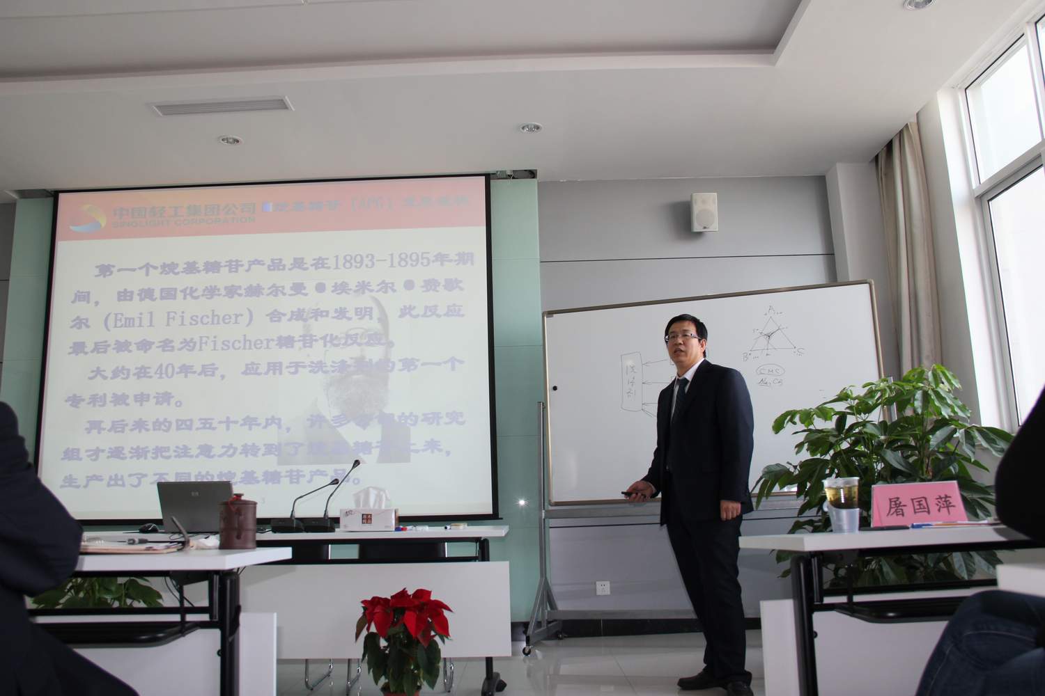 董萬(wàn)田總經(jīng)理首先對(duì)中輕物產(chǎn)領(lǐng)導(dǎo)及員工的來(lái)訪表示熱烈的歡迎;交流會(huì)上,王萬(wàn)緒院長(zhǎng)介紹了日化行業(yè)的發(fā)展趨勢(shì),指出了表面活性劑在日化行業(yè)中舉足輕重的地位;我公司技術(shù)部的楊慶利和張燕山分別對(duì)公司的主要產(chǎn)品APG和咪唑啉等進(jìn)行了深入詳細(xì)的介紹。在交流答疑和討論環(huán)節(jié),中輕物產(chǎn)員工對(duì)我公司的產(chǎn)品表現(xiàn)出濃厚的興趣,大家就幾款主要產(chǎn)品,尤其是APG系列產(chǎn)品的性能及應(yīng)用展開了熱烈的討論,雙方都期待進(jìn)一步加強(qiáng)在技術(shù)與市場(chǎng)方面的緊密合作,做到以技術(shù)保障市場(chǎng),市場(chǎng)反饋問題給技術(shù),進(jìn)而優(yōu)化產(chǎn)品性能,拓展產(chǎn)品應(yīng)用,共同實(shí)現(xiàn)技術(shù)與市場(chǎng)的雙贏。我公司及中輕物產(chǎn)的總經(jīng)理都表示對(duì)我們的綠色表面活性劑占有未來(lái)的國(guó)內(nèi)外市場(chǎng)充滿信心。最后,俞海星總裁在輕松愉快的氛圍中對(duì)我公司及中輕物產(chǎn)過去幾年的發(fā)展做出了充分的肯定,并鼓勵(lì)我們加強(qiáng)合作,共同發(fā)揮好中輕集團(tuán)在日化行業(yè)的領(lǐng)先優(yōu)勢(shì)。