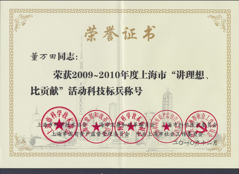 上海市科協(xié),上海市發(fā)展改革委員會、上海市科委、上海市國資委、上海市社會工作委員會等聯(lián)合發(fā)文,表彰2009-2010年度上海市“講理想、比貢獻”活動中做出突出成績和貢獻的先進集體和科技標兵。