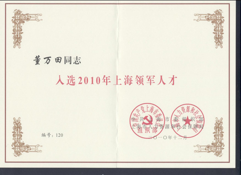 中共上海市委組織部、上海市人力資源和社會保障局做出決定,中國日化院副院長、上海發(fā)凱化工有限公司總經(jīng)理、教授級高級工程師董萬田同志入選2010年上海領(lǐng)軍人才。領(lǐng)軍人才是上海市為深入實施人才強市戰(zhàn)略,加快高層次創(chuàng)新型人才隊伍建設(shè)的培養(yǎng)計劃。這是董萬田同志繼2009年獲得上海市金山區(qū)“首批領(lǐng)軍人才”后的又一殊榮。